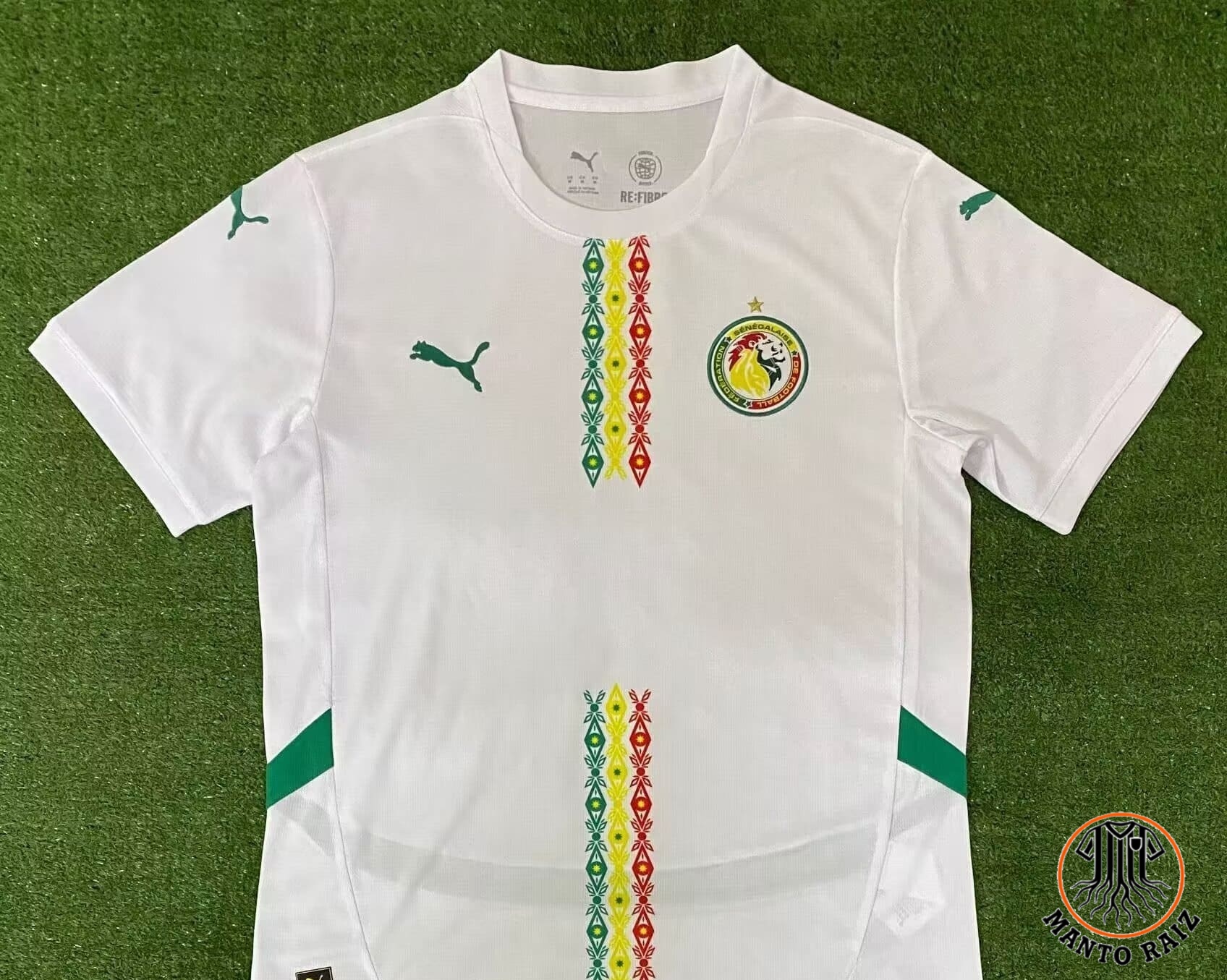Com as cores verde, amarelo e vermelho, além do símbolo da seleção, a camisa reflete a identidade nacional e o orgulho senegalês.
